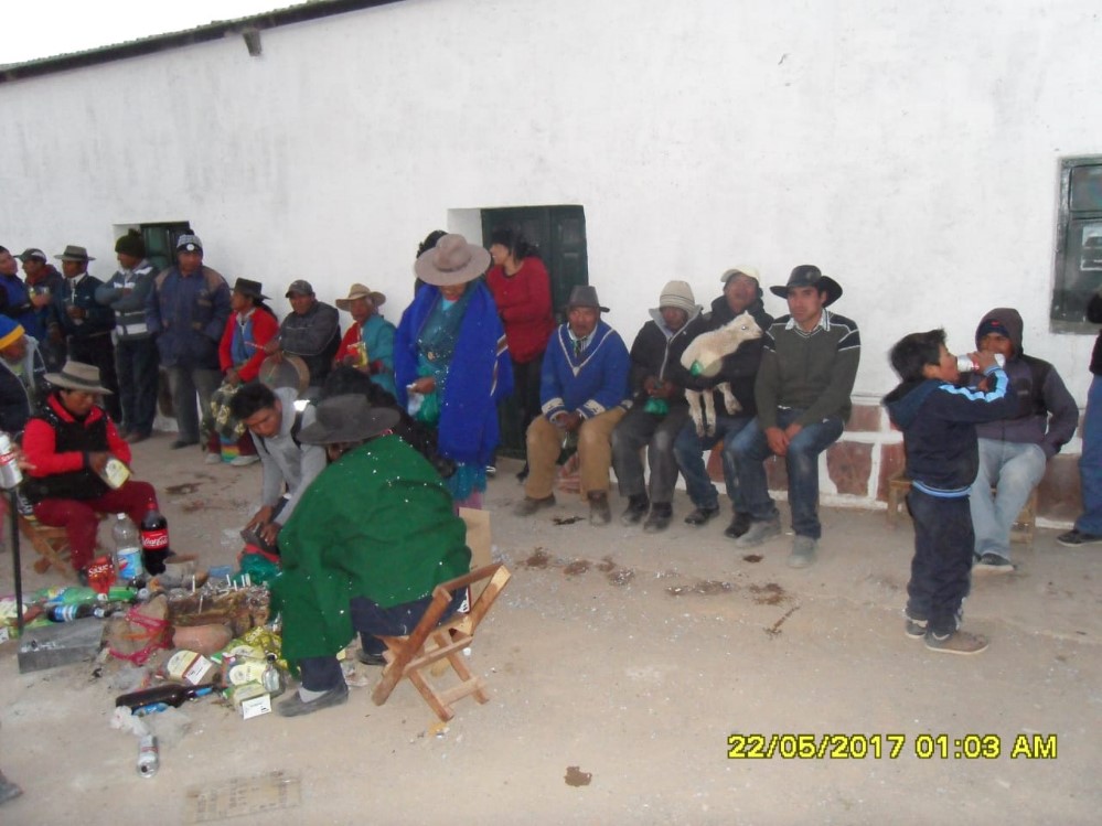 En este sentido, cualquier interpretación personal seguramente esté sesgada por valores preestablecidos. No obstante, intentemos buscar más allá de nuestro sistema de calificación occidental. Busquemos lo que quedó a orillas de la ciencia, aquello que subyace a la narrativa oficial. Para eso, dejemos que la construcción se realice desde la misma foto. Empecemos observando la pared blanca del fondo y esa línea horizontal de personas que no parecen tener ningún apuro. De la decena de personas solamente tres miran a cámara. Uno de ellos con su cachete izquierdo inflado de coca, otro con un cabrito encima se muestra sonriente. El último está un poco más alejado, mira con cierta timidez mientras sostiene una caja coplera. Vemos también que muchos dialogan entre sí. Algo que se repite son las bolsas verdes en la mano de la mayoría de los presentes, que, aunque sea una obviedad, se usan para guardar la coca. Pero detengámonos en la ceremonia. Allí pueden verse cuatro personas sentadas (a una de ellas solamente se le ve el pelo) alrededor de un círculo delimitado por piedras. Vemos también a una mujer parada concentrada en la ofrenda, que es este círculo por el cual se le convida bebida, alimento, tabaco y todo lo que se quiera compartir a la Madre Tierra. Fijémonos la cantidad de botellas, cajas de vino, bebida, agua que rodean la ofrenda. Todo para la Pachamama, en un acto ritual donde el centro del mundo es la naturaleza y no el sujeto. En un rito comunitario que dota de sentido la existencia de la comunidad por medio de su relación con la tierra. En la foto puede verse un gran nosotros donde la mayoría lleva sombrero o gorro y tienen los zapatos llenos de tierra. Rodolfo Kusch se preguntó una vez si éramos el paisaje o parte de él, concluyendo que inevitablemente somos el paisaje. Ojalá estas imágenes puedan ser un buen ejemplo de ello.