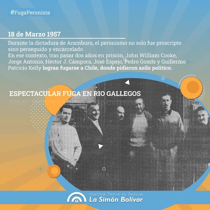 (*2) La fuga de Río Gallegos: cuando el golpe del 55, parece que la dispersión fue total, no hay olvidar que lo más graneado del Peronismo, "los jerarcas" como decían los compañeros estaban presos en la carcel de Río Gallegos: el “Turco Antonio", el Bebe Cooke, Espejo el líder de la CGT, Patricio Kelli líder de la Alianza Libertadora Nacionalista, el “Tío” Campora, el “Yorma" Alberte y el “Gallego” Gomiz. Cooke era el jefe nacional del Movimiento Peronista por orden de Perón y la fuga de Río Gallegos fue financiada por Jorge Antonio. Perón activó a Blanca Luz Brum, que estaba exiliada en Chile y la mamá de Alberte entró una 45 al penal en una visita. Patricio Kelli le contó alguna vez al Ñato Iglesias que lo tuvieron que persuadir al Tío Campora para fugarse. No querían dejarlo porque estaban seguros de que los gorilas lo fusilarían para vengarse y justificar la fuga como un enfrentamiento (lo que iba a pasar en Trelew 15 años después).
