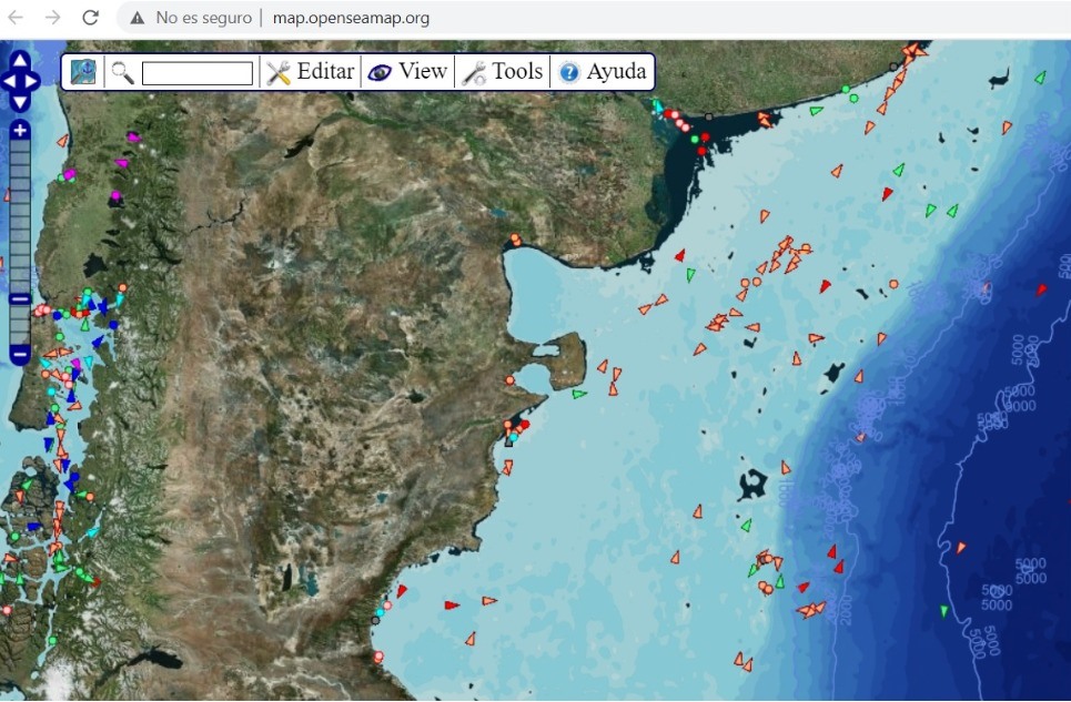 El mapa de www://openseamaps.org donde consignan datos de oleaje, vientos, profundidades, barcos con su "GPS" conectados. Todo lo pintado en negro son áreas de 10 mts de profundidad o menos.